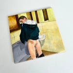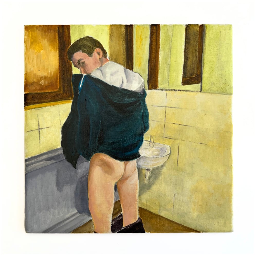 Part of a second series of paintings on ceramic tiles based on found images of lads peeing in public restrooms with their pants down.